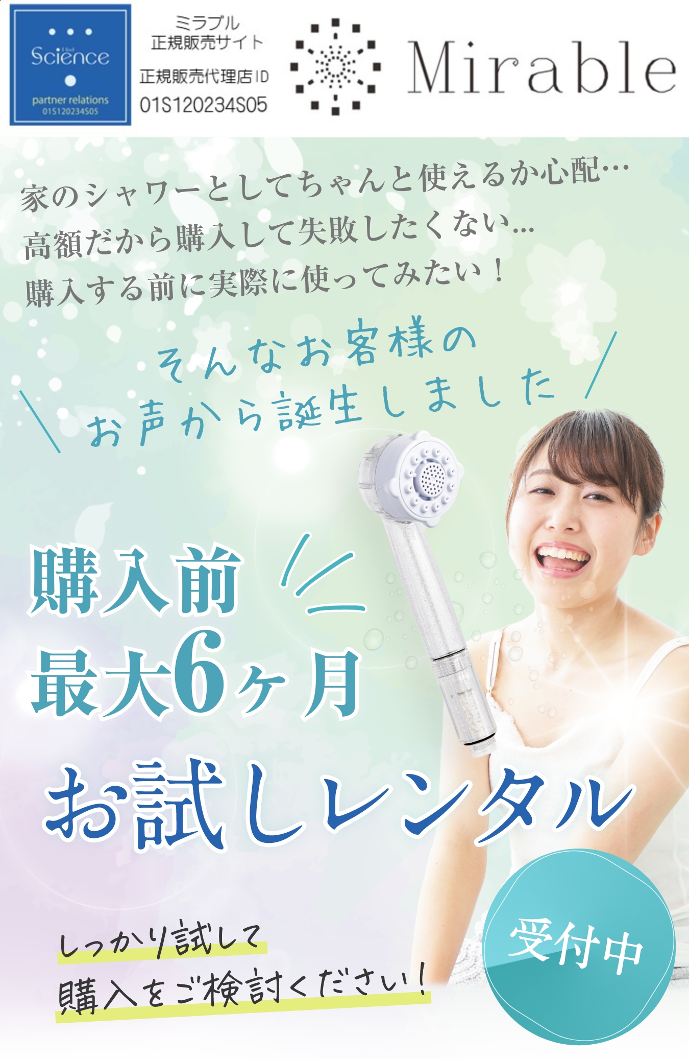 現在では出張先にも「携帯用ミラブル」を持参するほど、ご自身でも愛用されている青山会長。娘さんが幼い頃に肌トラブルが原因でいじめに合い、なんとかしてやれないかと考えていた時に「塩素の吸着でアレルギー反応」という文献を発見し、ミラブルの前身とも言える「塩素除去シャワー」を製造。入浴をひかえシャワーだけで生活をさせたところ、娘さんは「塩素系のトラブル」だったことが判明されたそうです。